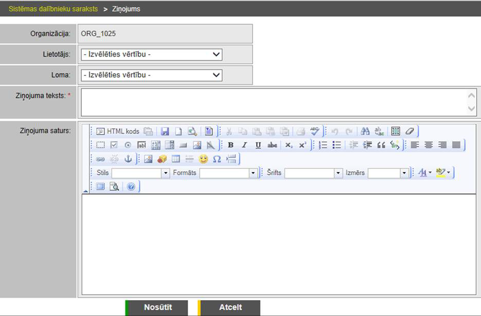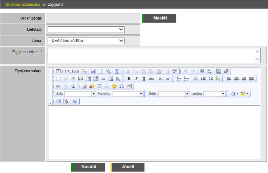 Piezīme! Ja nav aizpildītas vērtības Organizācija, Lietotājs vai Loma, tad sistēma nosūta ziņojumu un e-pastu visiem Sistēmas lietotājiem.