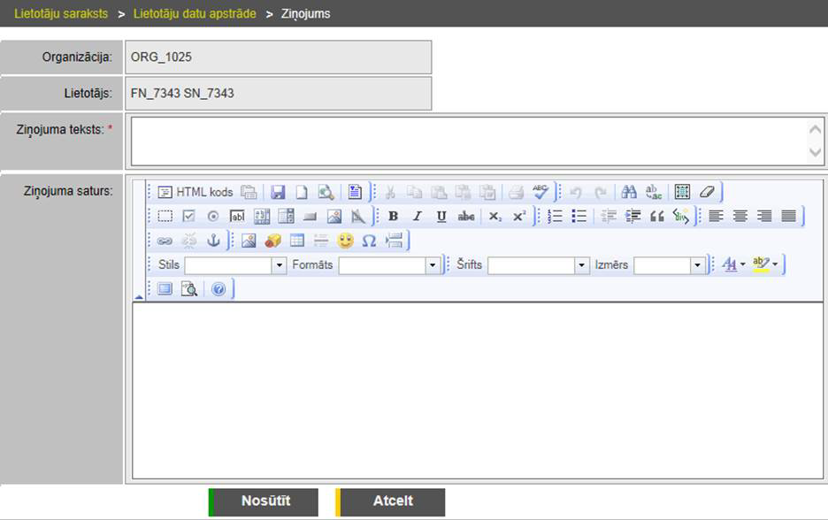 • Lietotājs – tiek attēlots tā lietotāja uzvārds un vārds, kuram lietotājs ir izvēlējies nosūtīt ziņojumu. Lauks ir aizpildīts ar atbilstošā lietotāja datiem un nav pieejams rediģēšanai, ja ziņojuma izveidošana ir izsaukta no lietotāja datu rediģēšanas ekrānformas.