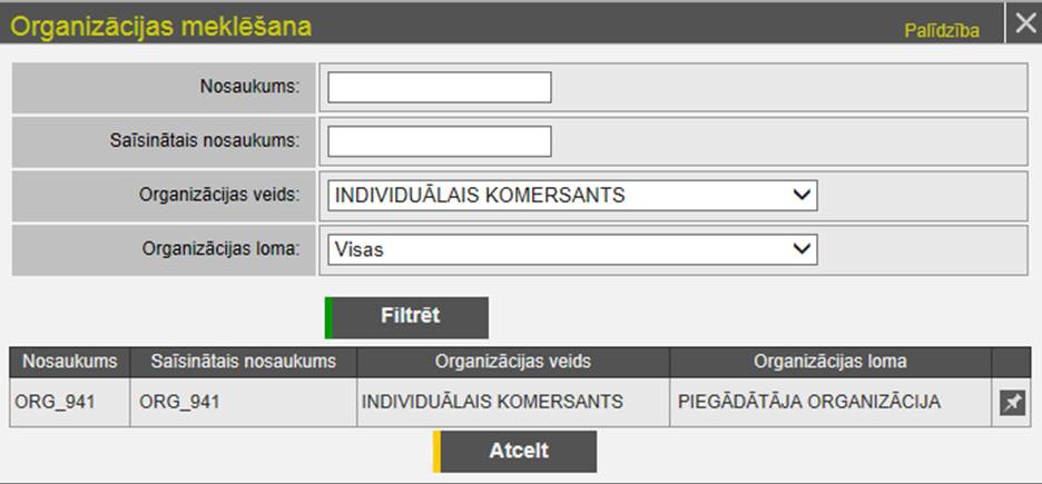 • Organizācijas meklēšanas filtrā tiek attēloti: