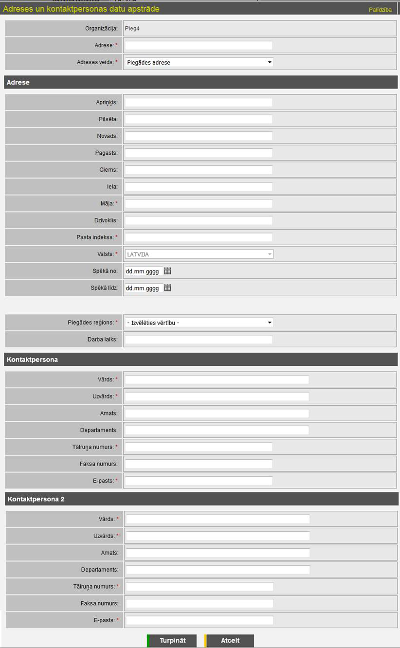Jaunas organizācijas adreses un tās kontaktpersonu datu reģistrēšana sistēmā ir pieejama autorizētiem sistēmas lietotājiem ar lomu Sistēmas administrators, Pircēja administrators vai Piegādātāja administrators.