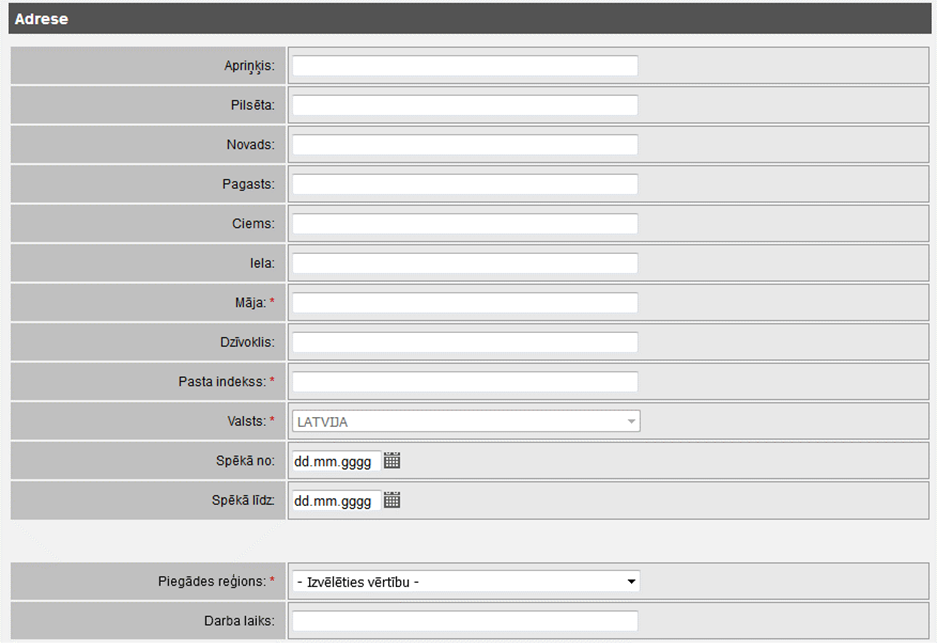 • Valsts – kā izvēle no sistēmā reģistrētiem valstu nosaukumiem, valsts norādīšanai. Pēc noklusējuma tiek attēlota valsts ‘Latvija’.