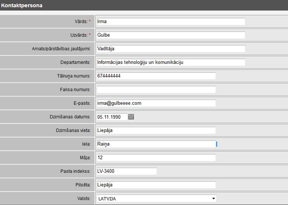 • Valsts – kā izvēle no sistēmā reģistrētiem valstu nosaukumiem, valsts norādīšanai. Pēc noklusējuma tiek attēlota valsts „Latvija”.
