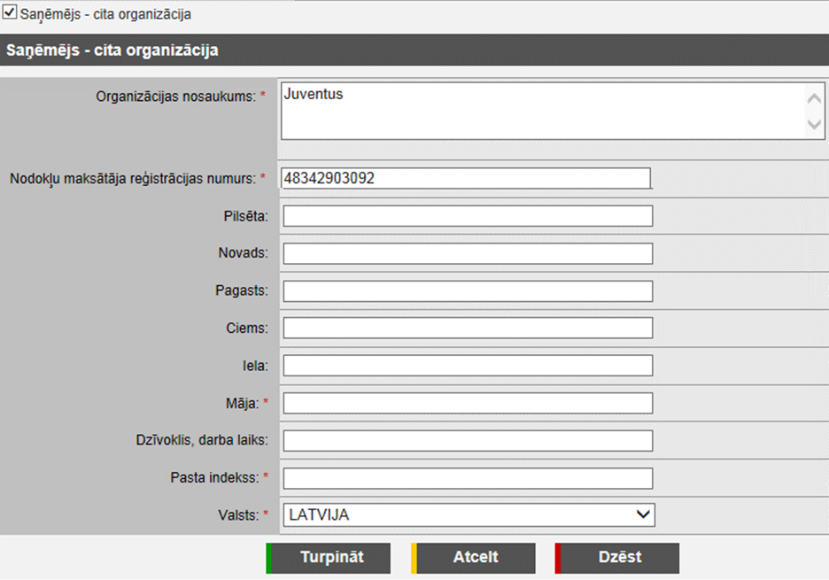 • Nodokļu maksātāja reģistrācijas numurs – ievadlauks saņēmēja organizācijas nodokļu maksātāja reģistrācijas numura norādīšanai.