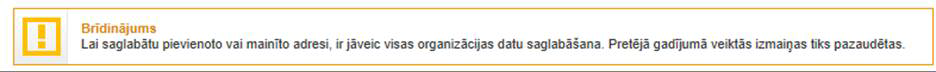 Piezīme! Lai dati tiktu saglabāti, ir jāveic datu saglabāšana organizācijas datiem, par ko tiek attēlots brīdinājuma paziņojums organizācijas datu ekrānformā: