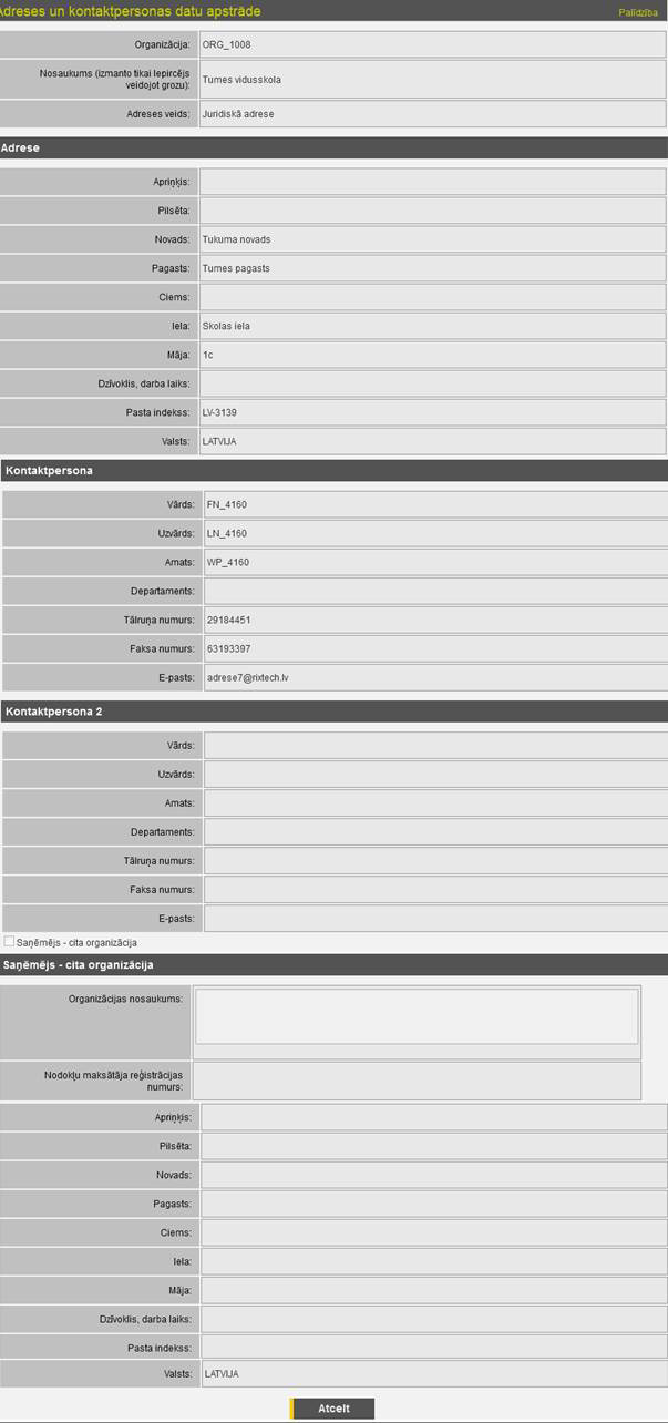 Lietotājs var apskatīt savai organizācijai norādīto adrešu un adresēm norādīto kontaktpersonu datus.