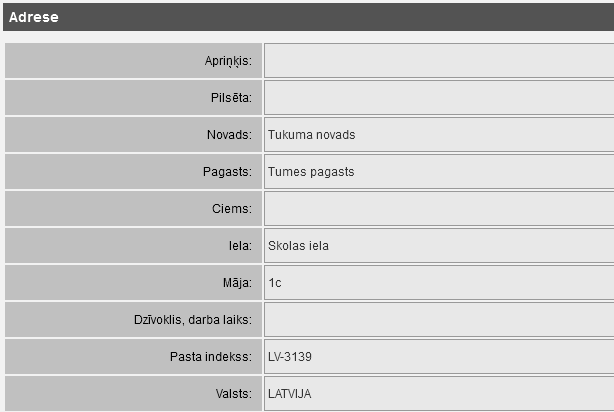 • Valsts – tiek attēlots adresi veidojošās valsts nosaukums.
