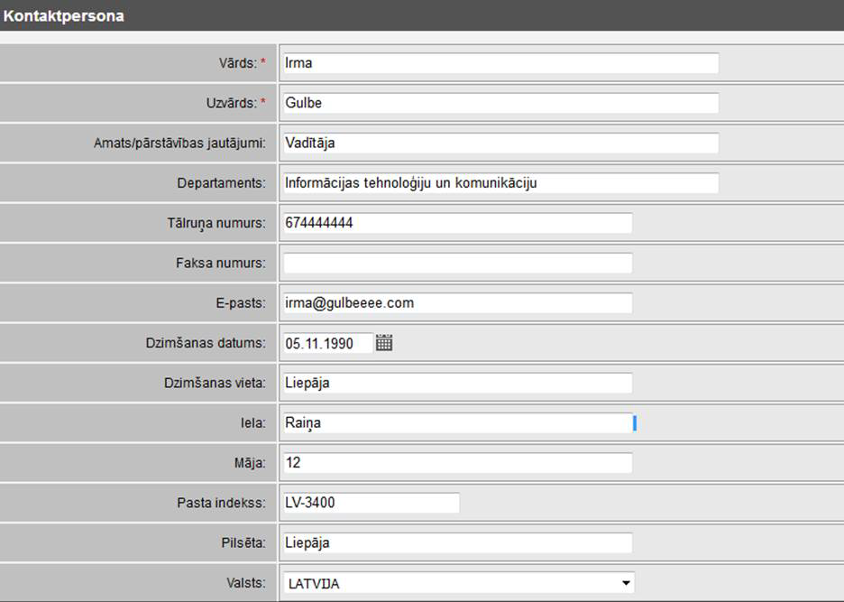 • Dzimšanas datums, Vieta – kontaktpersonas dzimšanas datums un vieta.
