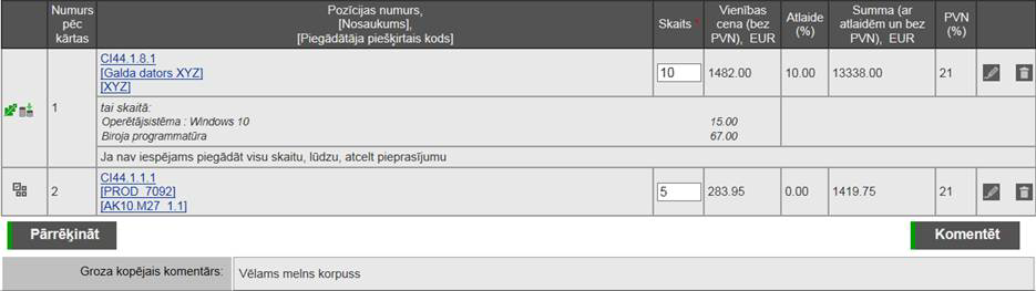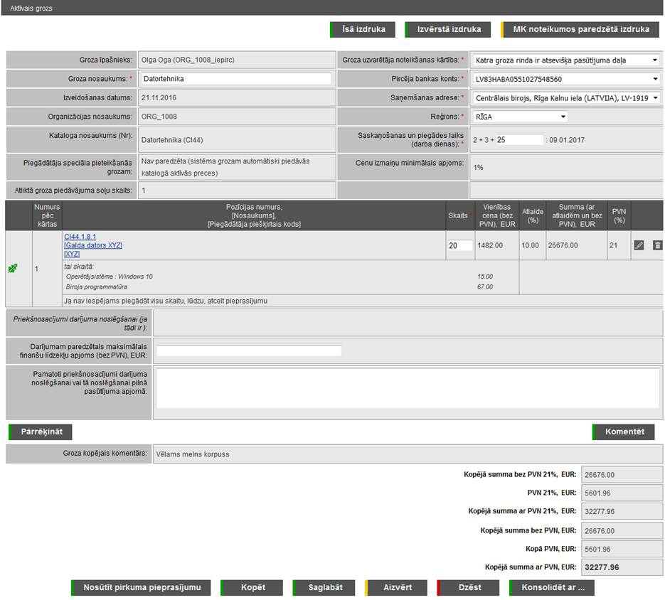 § Viss grozs ir viena pasūtījuma daļa – visas grozā norādītās preces tiks iekļautas vienā pasūtījumā. Izvēloties šo vērtību, obligāti ievadāms komentārs laukā Pamatojums groza uzvarētāja noklusētās noteikšanas kārtības maiņai.