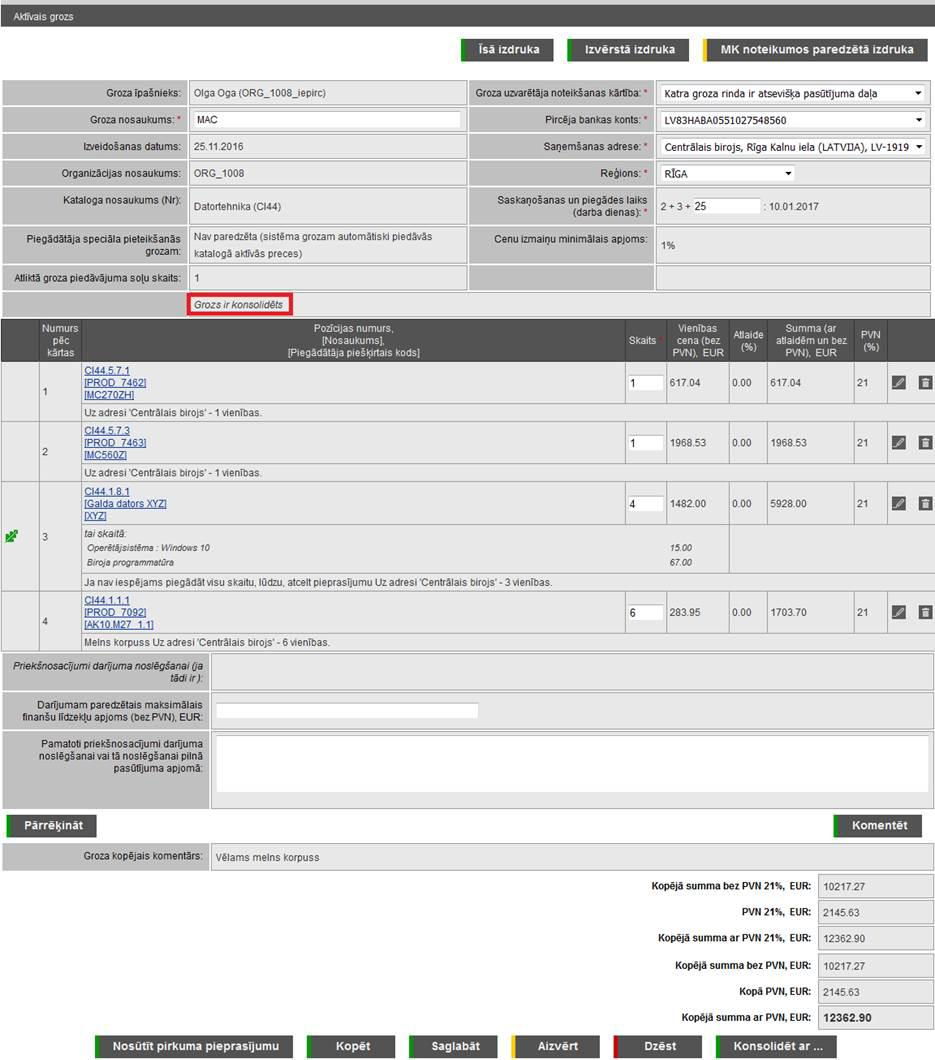 Ekrānforma 86. Konsolidēts, jeb apvienots grozs
