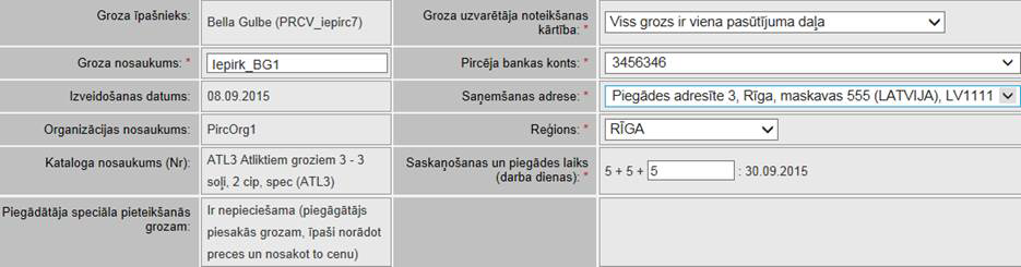 • Groza uzvarētāja noteikšanas kārtībā – nosaka pasūtījumu veidošanas kārtību. Pieejamās izvēlnes tiek definētas katram katalogam. Iepircējs norāda šo kārtību, lai precizētu pasūtījumu: