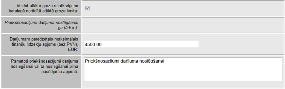• Pamatojums groza uzvarētāja noklusētās noteikšanas kārtības maiņai – ja tiek mainītā noklusētā (katalogam norādītā) groza uzvarētāja noteikšanas kārtība, laukā jāieraksta pamatojums.
