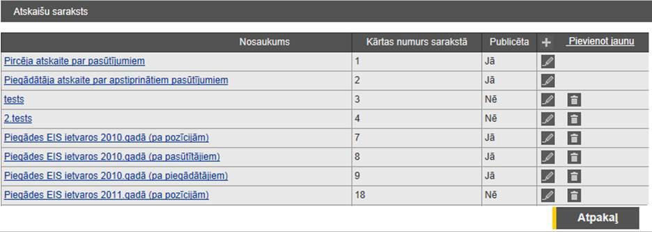 Atskaišu saraksts administrēšanai ir pieejams, atverot