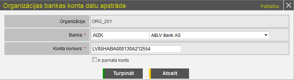 Piezīme! Ja bankas kontam tiek uzstādīta pazīme, ka tas ‘Ir pamata konts’, bet organizācijai jau eksistē kāds bankas konts, kurš Ir pamata konts, tad sistēma attēlo brīdinājuma paziņojumu. Ja lietotājs apstiprina brīdinājuma paziņojumu, tad iepriekš uzstādītajam pamata kontam pazīme tiek noņemta un kā pamata konts tiek uzskatīts bankas konts, kuram pazīme tika uzstādīta.