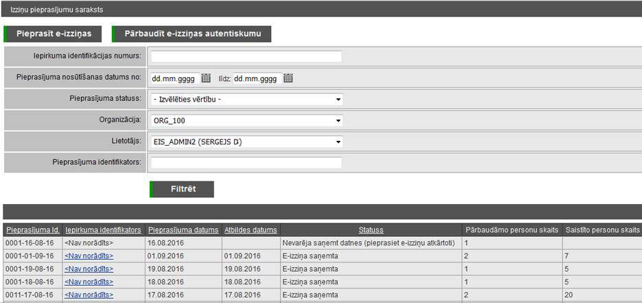E-izziņu pieprasījumu sarakstā Pircēju un Piegādātāju organizāciju lietotāji var atlasīt, izmantojot filtrēšanas bloku, un skatīt savas organizācijas e-izziņu pieprasījumus, Sistēmas uzturētāju organizācijas lietotāji – visus sistēmā veidotos e-izziņu pieprasījumus.