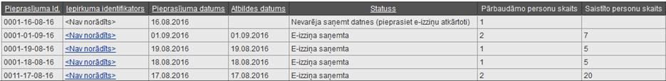 • Pārējos statusos identifikators ir kā hipersaite, kurai uzklikšķinot tiek atvērta e-izziņu pieprasījuma kopsavilkuma apskates forma (sk. aprakstu E-izziņu pieprasījumu kopsavilkuma apskate).
