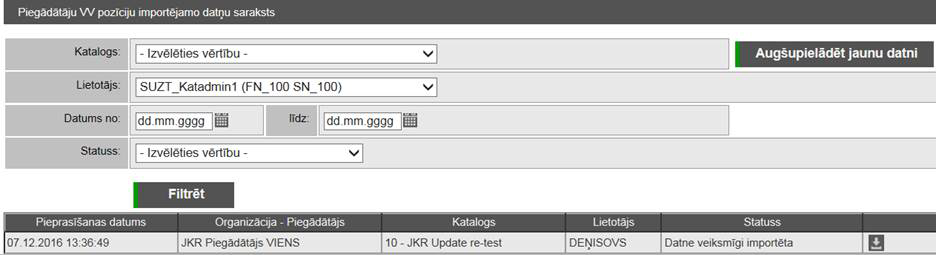 Importējamo piegādātāja VV pozīciju datņu saraksts ir pieejams autorizētiem sistēmas lietotājiem ar lomu – Katalogu administrators.