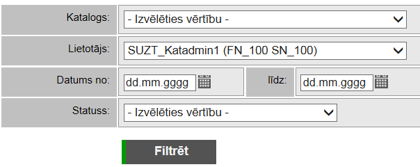Piezīme! Ja filtrēšanas parametros ir norādīts datumu intervāls, tad tiek atlasītas tās datnes, kas ir augšupielādētas šajā datumu intervālā. Datumu intervāla galapunkti nav obligāti.