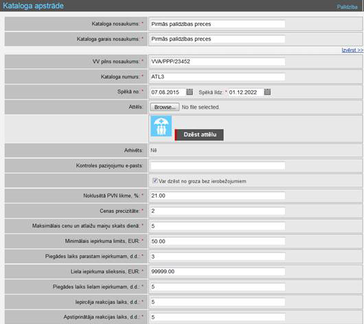 Ekrānformā tiek attēloti šādi ievadlauki, kas izsaucot Kataloga datu rediģēšanu, jau ir aizpildīti ar iepriekš sistēmā saglabātajām vērtībām: