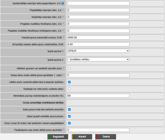 •Atliktiem groziem var piedāvāt speciālu preci – ja pazīme atzīmēta, tad atliktajiem groziem Piegādātāji var piedāvāt preci un norādīt cenas. Ja pazīme nav atzīmēta, sistēma automātiski ievieto grozā lētāko Piegādātāju aktīvo preci VV pozīcijā.