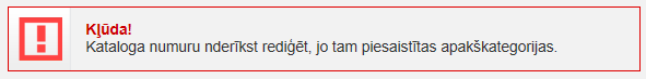 Ja tiek veikta Kataloga, kuram ir piesaistīta kāda apakškategorija, numura rediģēšana un datu saglabāšana, sistēma attēlo kļūdas paziņojumu: