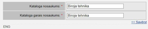 •Atverot bloku apskatei, ekrānformā hipersaites nosaukums tiek mainīts uz Savērst>>, uz kuras uzklikšķinot, bloks tiek savērsts, to vairs ekrānformā neattēlojot. Šajā blokā tiek attēloti lauki ‘Kataloga nosaukums’ un ‘Kataloga garais nosaukums’ katrai sistēmā reģistrētajai valodai, kur par valodu tiek attēlots tās nosaukums: