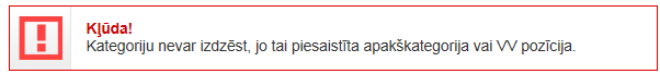 Piezīme! Kategoriju nevar dzēst, ja tai ir piesaistīta kaut viena apakškategorija vai VV pozīcija.