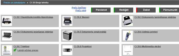Kategoriju sarakstu lietotājs var iegūt „e-pasūtījumu” apakšsistēmā, uzklikšķinot uz šķirkļa „Preces un pakalpojumi”, uz izvēloties Kataloga nosaukumu attēlotajā Katalogu sarakstā (skat. aprakstu Katalogu saraksta apskatīšana).