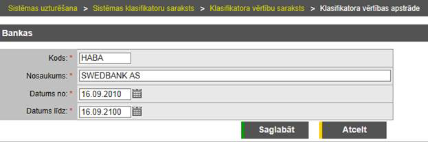 Tiek atvērta ekrānforma izvēlētās klasifikatora vērtības rediģēšanai, kurā tiek attēloti iepriekš saglabātie dati: