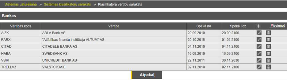 Tiek attēlots saraksts ar tām izvēlētā klasifikatora vērtībām, kas dotajā brīdī ir reģistrētas sistēmā: