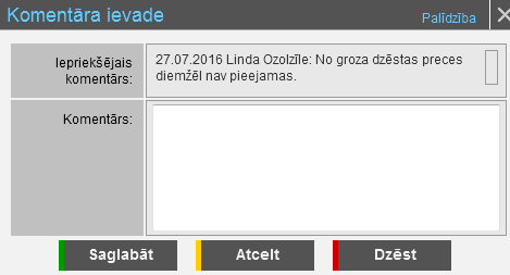 • Komentārs – daudzrindu teksta ievadlauks lietotāja komentāra pašreizējā pasūtījuma statusā norādīšanai.