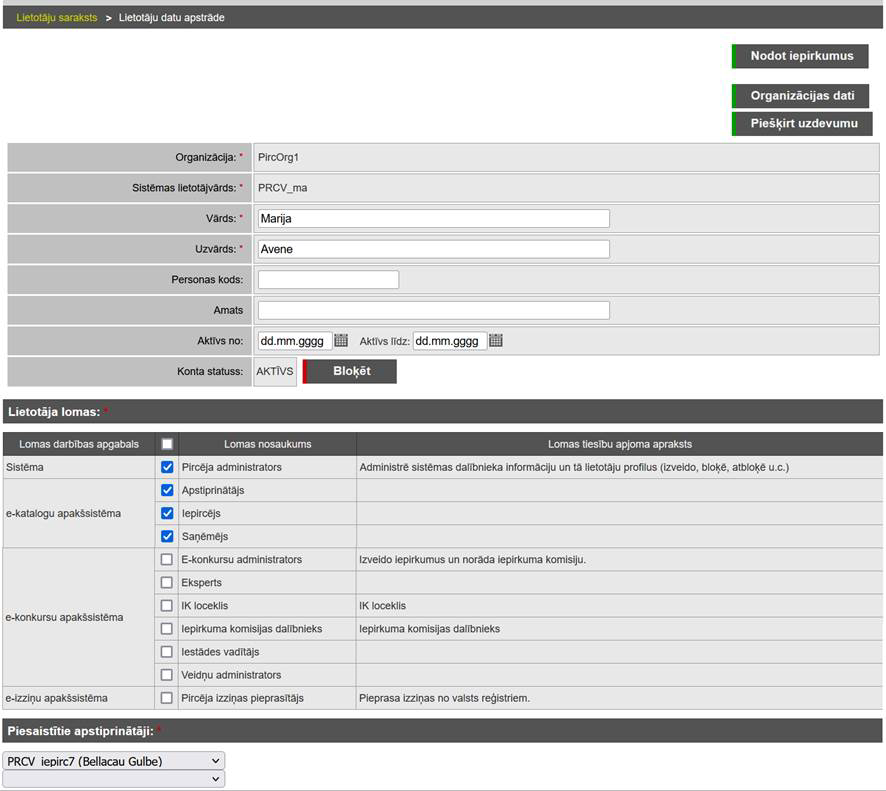 Piezīme! Bloks ir pieejams tikai to lietotāju datiem, kuru organizācijas procesa loma ir ‘Pircēja organizācija’, turklāt tikai tad, ja ‘Lietotāja lomas’ blokā atzīmēta loma ‘Iepircējs’.