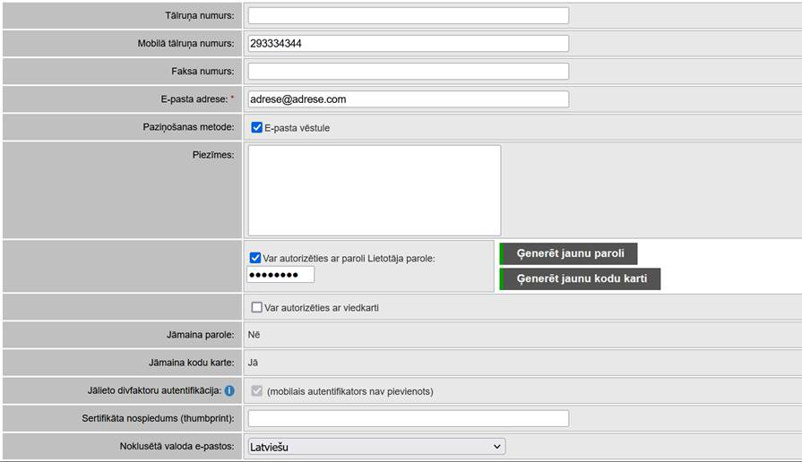 Piezīme! Ja lietotājam norādīts, ka tas var autorizēties ar paroli, tad ir jānorāda arī lietotāja parole un jāveido kodu karte.