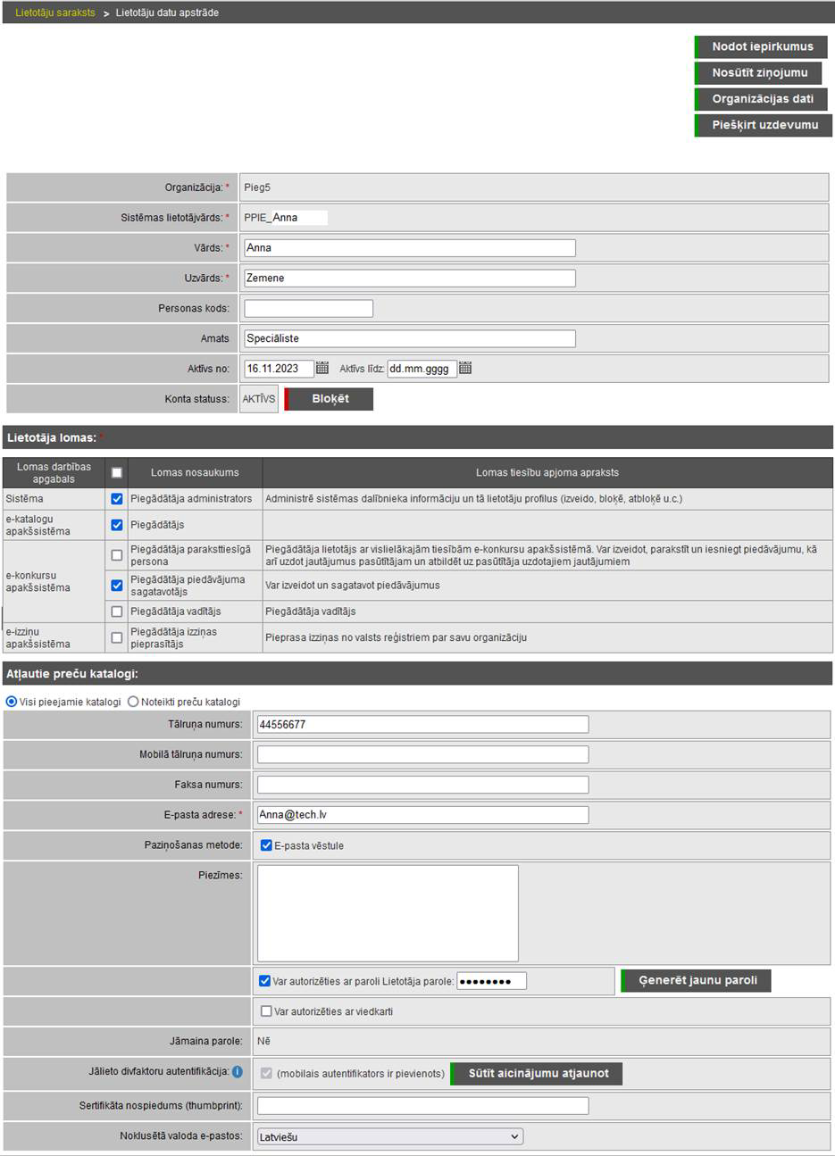 Piezīme! Izveidot lietotājus un piešķirt tiem lomas var gan sistēmas administratori, gan Pircēju un Piegādātāju organizāciju administratori. Izņēmums ir lomas „Pircēja izziņas pieprasītājs” un „Piegādātāja izziņas pieprasītājs”, kuras Pircēju un Piegādātāju organizāciju administratoriem pieejamas tikai tad, ja organizācijas konfigurācijas parametra ‘Administratori var piešķirt e-izziņu pieprasītāju lomas’ vērtība ir 1. Sistēmas administratori šo lomu var piešķirt lietotājiem neatkarīgi no organizācijas konfigurācijas parametros norādītās vērtības.