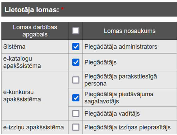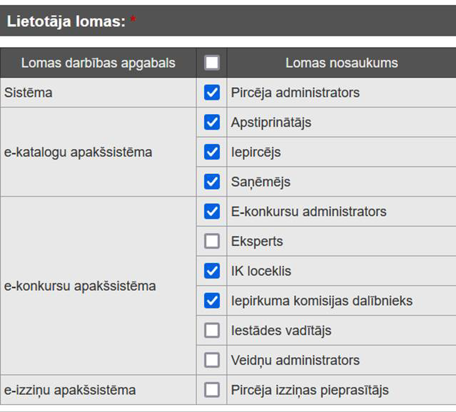• Lietotāja loma – kā izvēles rūtiņa, kuru atzīmējot, lietotājam tiks piešķirta izvēlētā loma. Izķeksējot iepriekš piešķirto lomu, tā lietotājam pie datu saglabāšanas tiks atņemta.