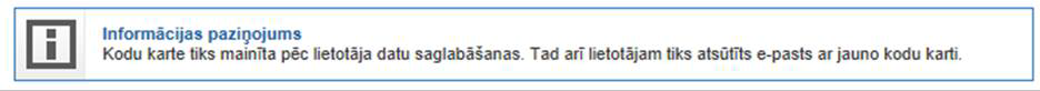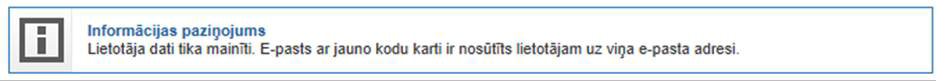 § Savukārt, ja lietotāja datu rediģēšanas laikā tika veikta jaunas Kodu kartes ģenerēšana, tad pēc lietotāja datu aktualizēšanas tiek attēlots informatīvs paziņojums, kurā norādīts, ka jaunā kodu karte ir nosūtīta uz lietotāja e-pastu: