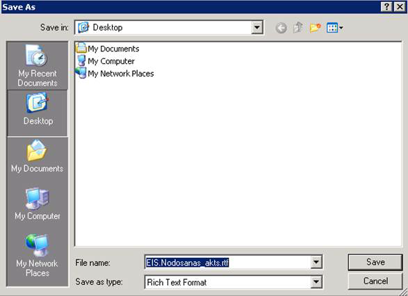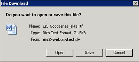 Piezīme! Sistēmas ģenerētajai *.rtf datnei pēc noklusējuma tiek piešķirts nosaukums „EIS.Nodosanas_akts”.