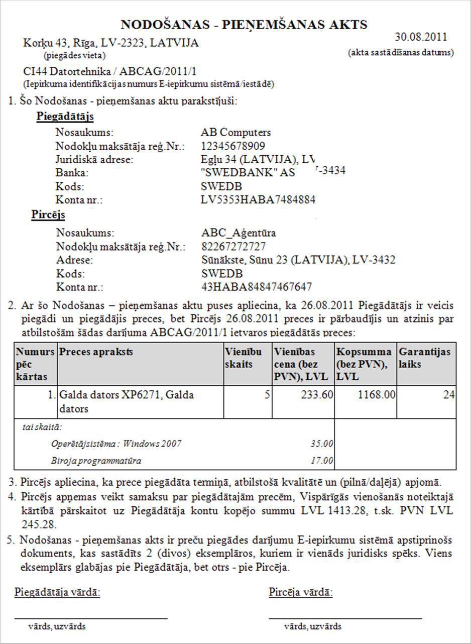 Ekrānforma 119. Nodošanas-pieņemšanas akta saturs - piemērs
