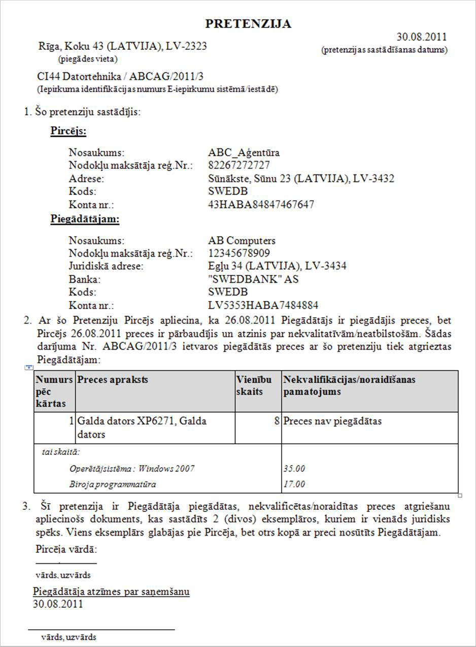 Piezīme! Pretenzijā kolonu 'Vienību skaits' aizpilda ar 'Šajā piegādē iekļautais skaits' mīnus 'Kvalitatīvais skaits'.