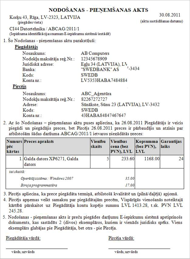 Piezīme! Nodošanas-pieņemšanas aktā preču uzskaitījumā iekļauj datus par visām piegādes rindām.