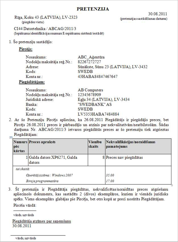 Pretenzijā datus aizpilda šādi: