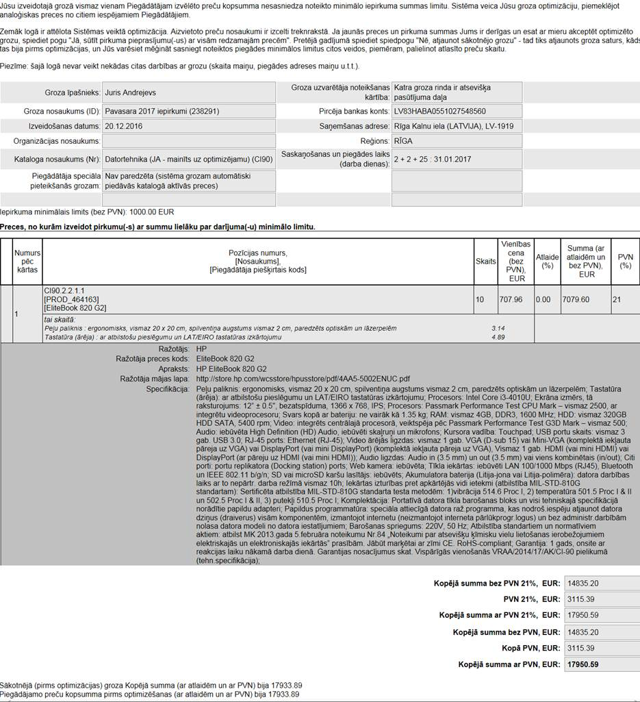 Optimizēta groza izvērstās informācijas izdrukāšana ir pieejama tikai autorizētiem reģistrētiem sistēmas lietotājiem ar lomu Iepircējs.