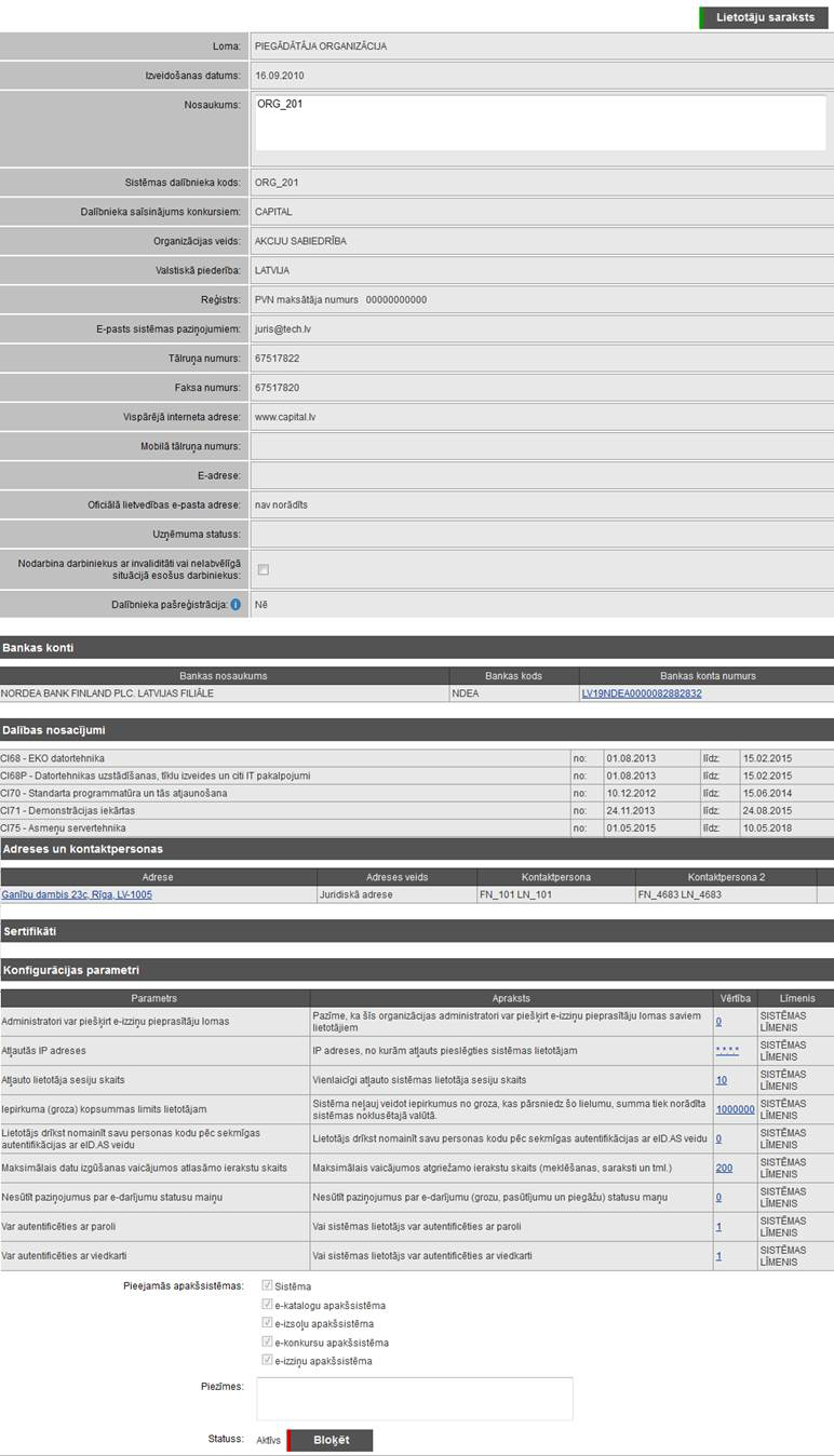 Ekrānforma 159. Organizācijas datu apskate – piemērs