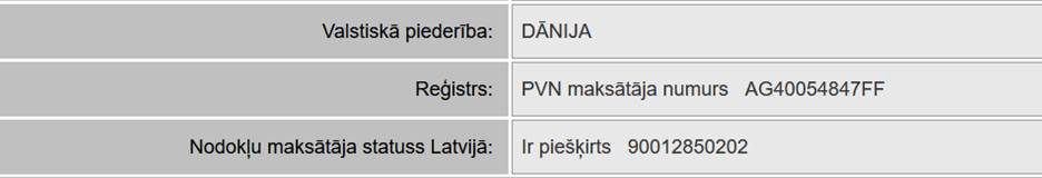 • Nodokļu maksātāja statuss Latvijā – organizācijām, kurām valstiskā piederība nav Latvijas – nodokļu maksātāja statuss Latvijā un nodokļu maksātāja Latvijā kods, ja statuss piešķirts. Kods tiek izmantots, pieprasot E-izziņas.