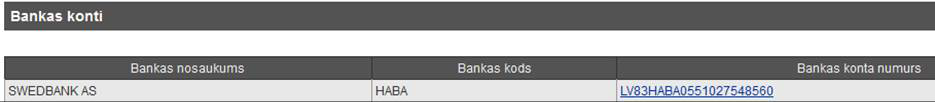 •Bankas konta numurs – kā hipersaite, tiek attēlots pievienotā bankas konta numurs. Noklikšķinot uz hipersaites tiek atvērta izvēlētā bankas konta datu apskates ekrānforma (skat. aprakstu Bankas konta datu apskatīšana|topic=Bankas konta datu apskatīšana).