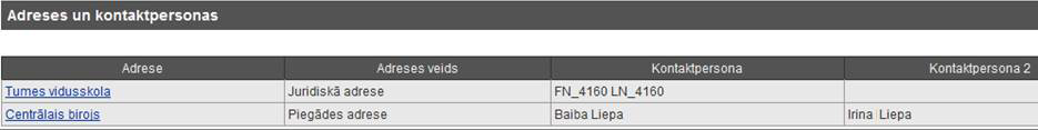 •Adrese – kā hipersaite tiek attēlots adresei piešķirtais nosaukums. Noklikšķinot uz hipersaites tiek atvērta izvēlētās adreses un tās kontaktpersonas datu apskates ekrānforma (skat. aprakstu Adreses un tās kontaktpersonu datu apskatīšana|topic=Adreses un tās kontaktpersonu datu apskatīšana).