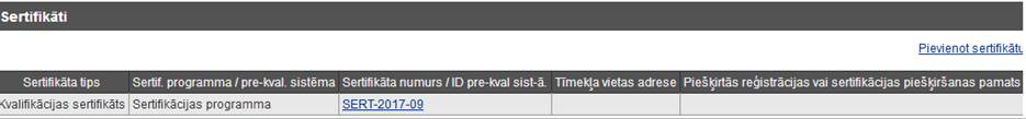 Organizācijas kvalifikācijas sertifikātu un pre-kvalifikācijas sistēmas pierādījumu informācija. Sertifikātu informācija tiek izmantota e-konkursu apakšsistēmas iepirkumos, kuros piemērotas ESPD izslēgšanas kritēriju un atlases prasības.