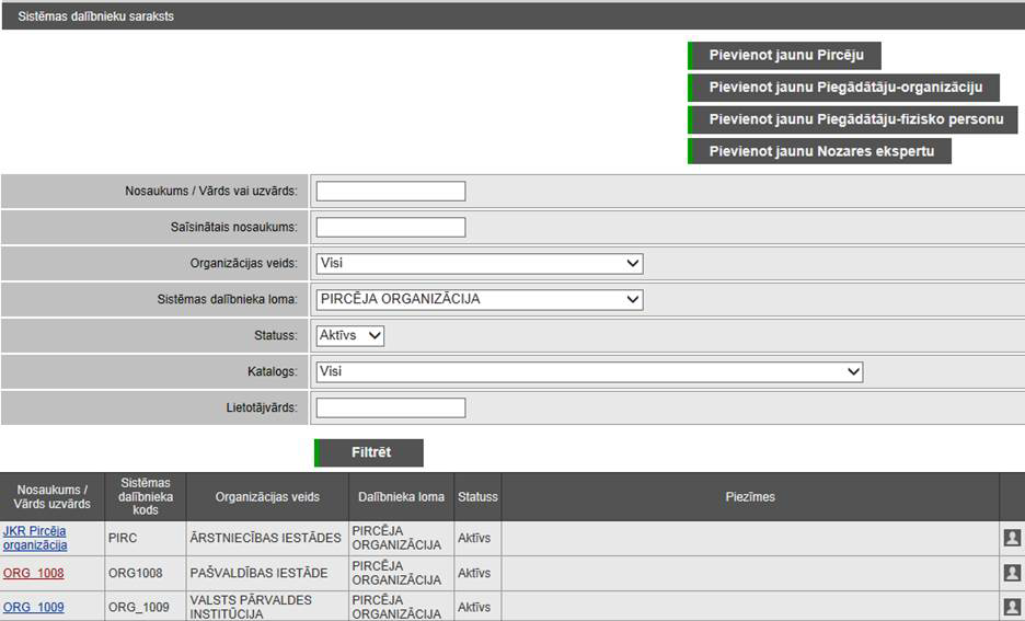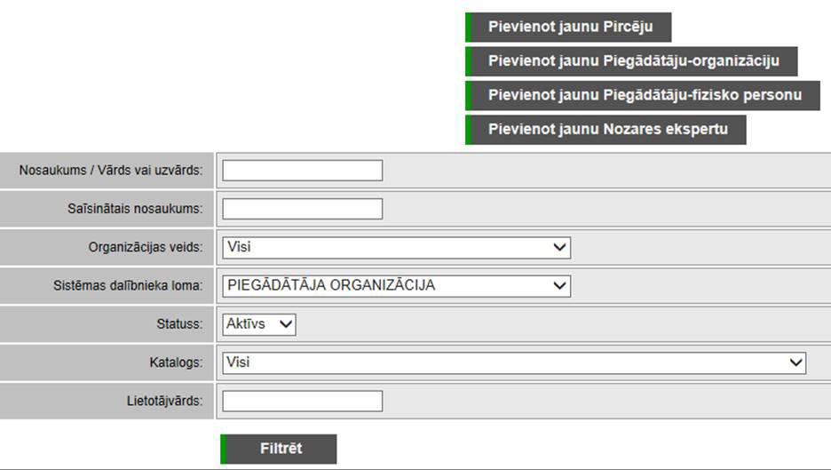 Piezīme! Izsaucot organizāciju saraksta formu, tajā tiek attēlots tikai organizāciju atlasīšanas filtrs un iespējas pievienot jaunas organizācijas. Lai iegūtu organizāciju sarakstu, ir jāveic saraksta filtrēšana.