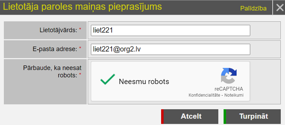• Vai sistēmā ir reģistrēts lietotājs ar norādīto lietotājvārdu un e-pasta adresi;