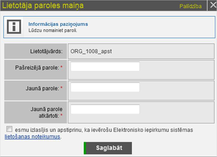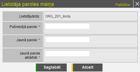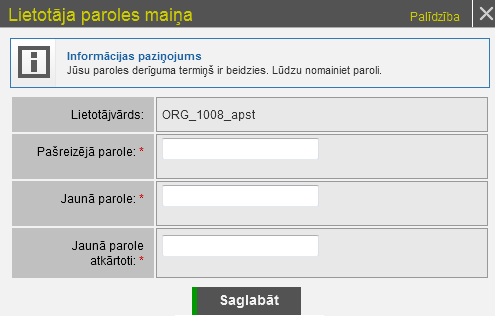 Piezīme! Ievadlaukos ‘Jaunā parole’ un ‘Jaunā parole atkārtoti’ norādītajām lietotāja parolēm ir jābūt identiskām.