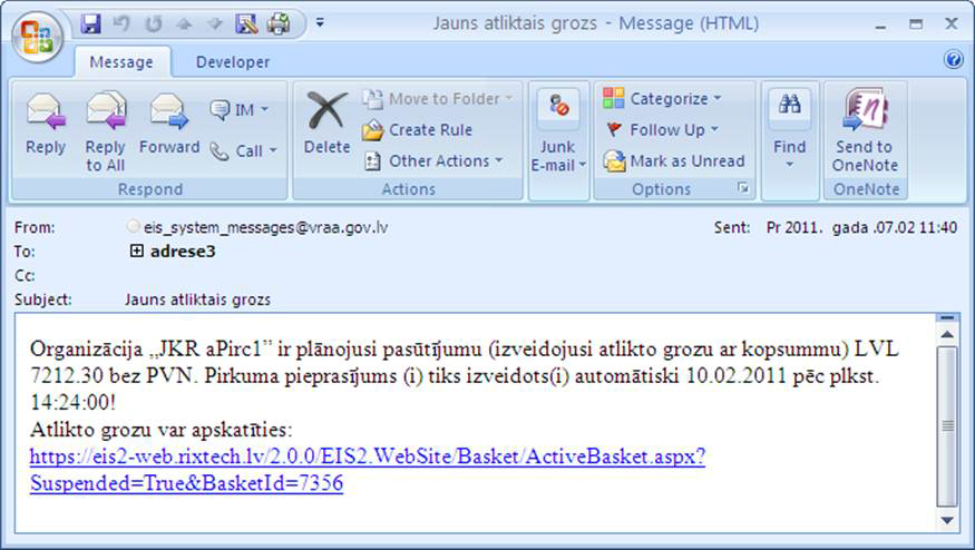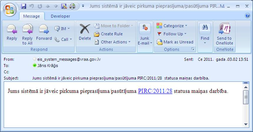 E-pastā norādītais Pirkuma pieprasījuma/pasūtījuma numurs ir kā hipersaite, uz kuras uzklikšķinot tiek iniciēta Pasūtījuma datu apskatīšana un apstrāde (skat. aprakstu Pasūtījuma apskatīšana un apstrāde).